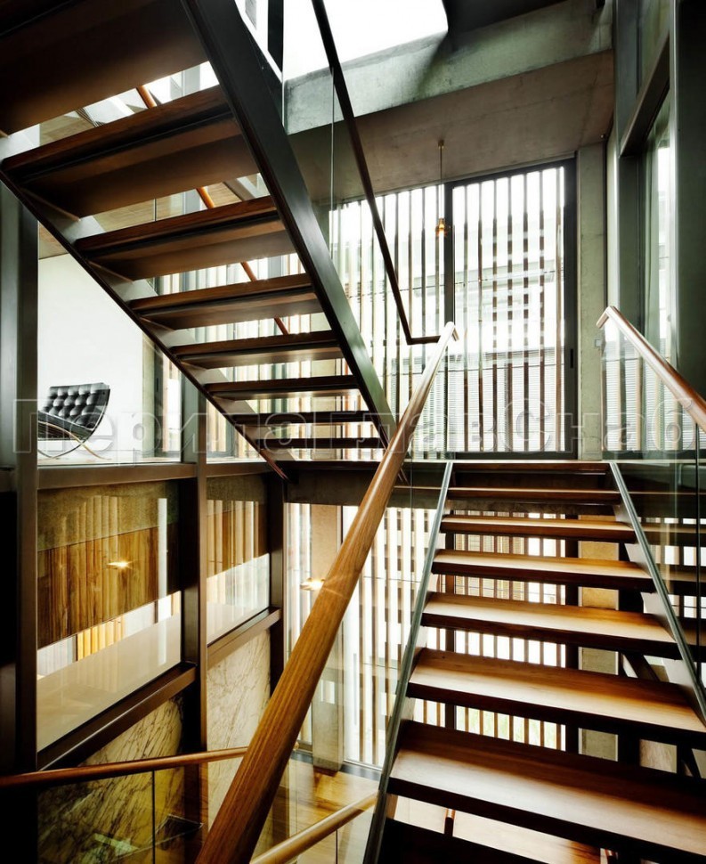 Ограждение с деревянным поручнем на выносе на точечном креплении на лестнице
