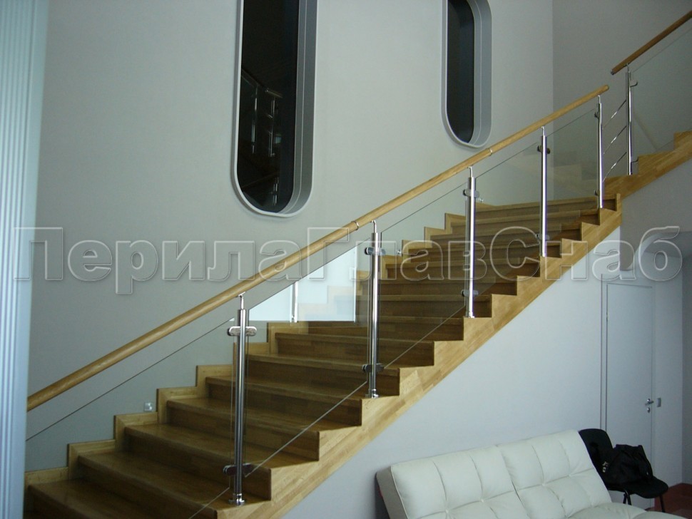 Ограждение с деревянным поручнем с зажимными стеклодержателями и стойками
