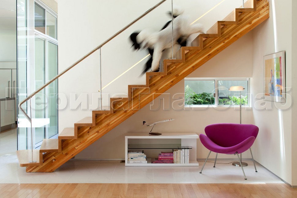 Ограждения с двумя стойками в каждую ступень с деревянным поручнем и без ригелей