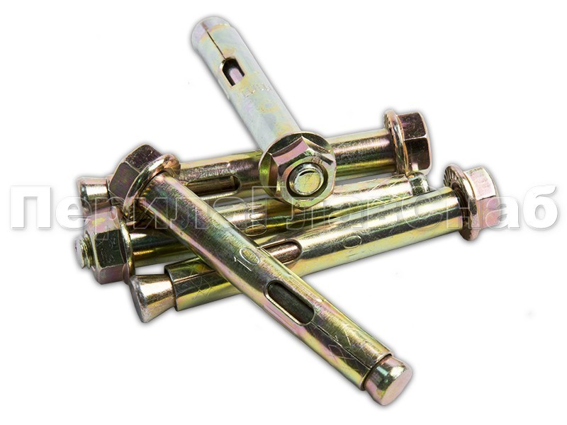 Анкер болт с гайкой представляет собой сложное крепежное изделие, которое состоит из втулки(внешней оболочки), шпильки с распором с конусом на конце и гайки-прокладки с запрессованной шайбой. При монтаже анкерного болта с гайкой, шпилька выступает за края анкера, и увеличивает его общую длину, а при закручивании гайки, шпилька с распором перемещается в сторону гайки, расклинивая втулку (внешнюю оболочку), которая и упирается в стенки отверстия, обеспечивая надежность крепления.
