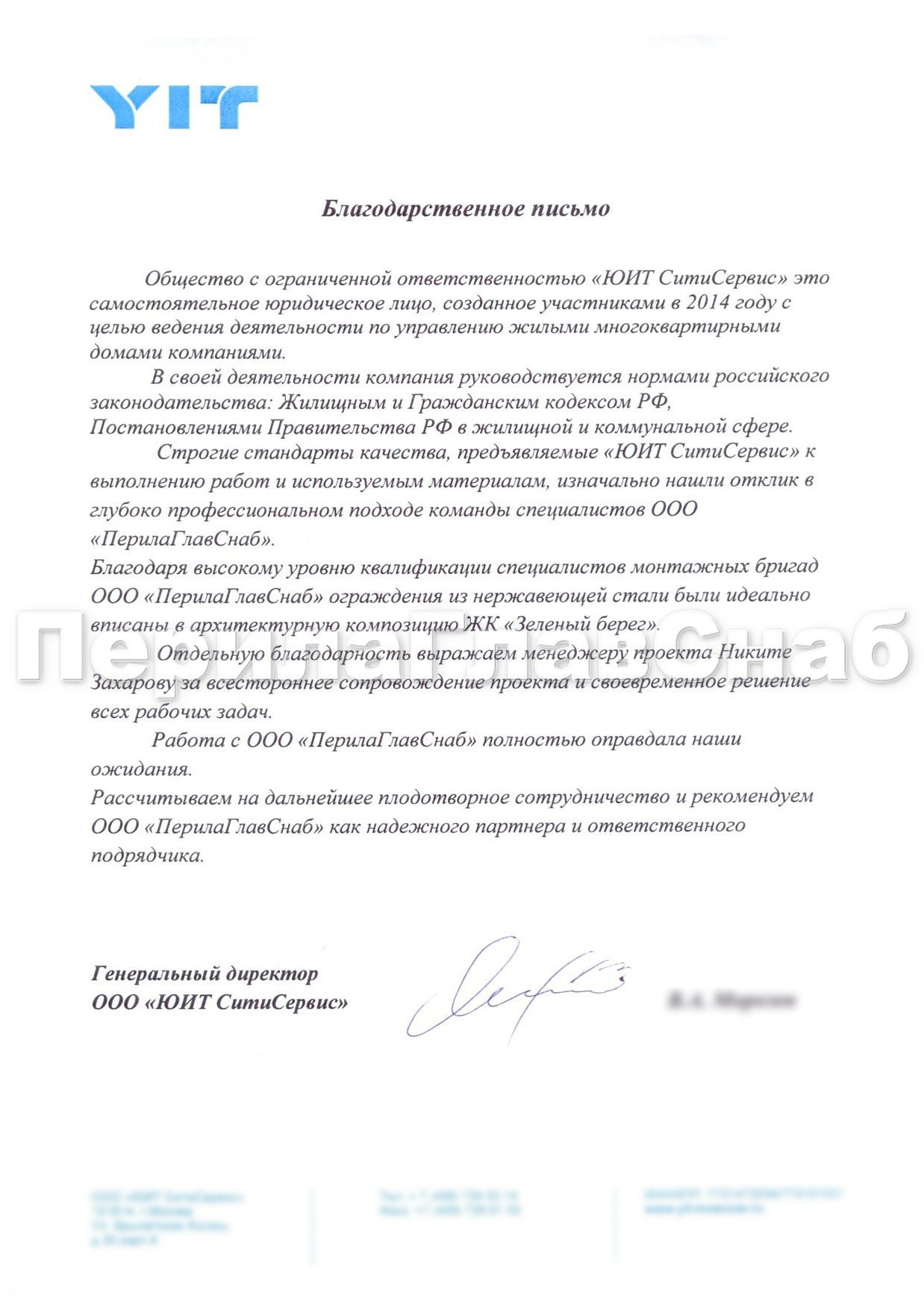 Благодарственное письмо от компании ООО «ЮИТ СитиСервис» Общество с ограниченной ответственностью «ЮИТ СитиСервис» это самостоятельное юридическое лицо, созданное участниками в 2014 году с целью ведения деятельности по управлению жилыми многоквартирными домами компаниями. В своей деятельности компания руководствуется нормами российского законодательства: Жилищным и Гражданским кодексом РФ, Постановлениями Правительства РФ в жилищной коммунальной сфере. Строгие стандарты качества, предъявляемые «ЮИТ СитиСервис» к выполнению работ и используемым материалам, изначально нашли отклик в глубоко профессиональном подходе команды специалистов ООО «ПерилаГлавСнаб». Благодаря высокому уровню квалификации специалистов монтажных бригад ООО «ПерилаГлавСнаб» ограждения из нержавеющей стали были идеально вписаны в архитектурную композицию ЖК «Зеленый берег». Отдельную благодарность выражаем менеджеру проекта Никите Захарову за всестороннее сопровождение проекта и своевременное решение всех рабочих задач. Работа с ООО «ПерилаГлавСнаб» полностью оправдала наши ожидания. Рассчитываем на дальнейшее плодотворное сотрудничество и рекомендуем ООО «ПерилаГлавСнаб» как надежного партнера и ответственного подрядчика.