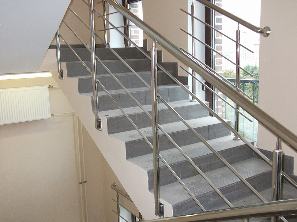 Если в местах общего пользования со значительной проходимостью ширина лестничного пролета превышает 2,5 метра, согласно СНиП 2.08.02-89, на расстоянии 0,9 метра должны быть установлены разделительные ограждения с опорными поручнями. Если на лестнице присутствуют узкие участки, использовать такие конструкции не понадобится.