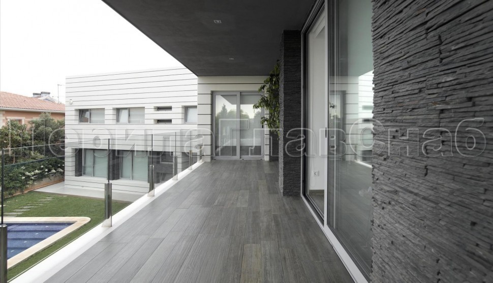 Ограждение с деревянным поручнем на выносе на точечном креплении