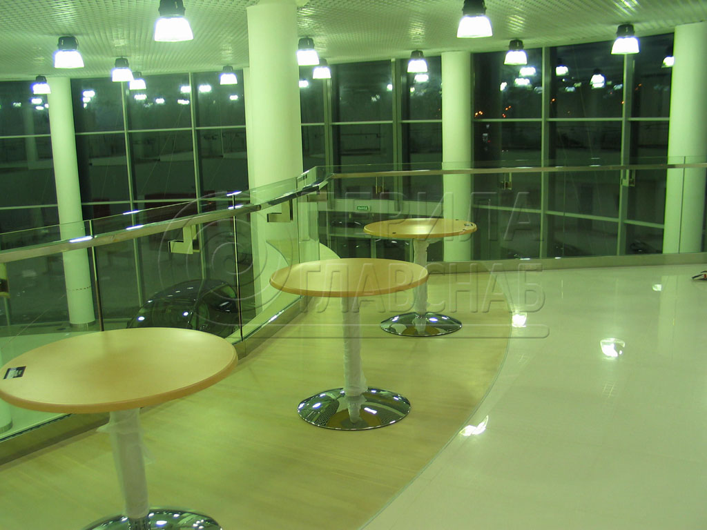Описание: Заказчик поставил задачу установить надежные, удароустойчивые ограждения в офисный центр. Плюс требовалось подчеркнуть респектабельность и успешность проекта. Ограждения устанавливались в полностью подготовленный интерьер с мраморной плиткой. Сроки были очень сжаты, заказчик торопился со сдачей проекта. Наш отдел проектирования предложил следующее решение: ограждения на несущем стекле с креплением на анодированный профиль. Характеристики:
