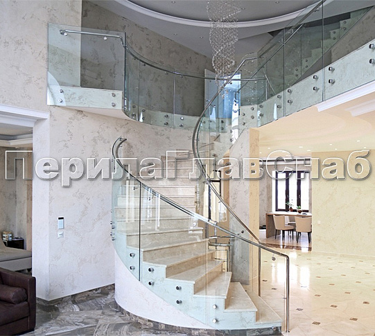 • на выносных держателях к стеклу, прокатан по радиусу на балюстраде, имеет конструкцию винта на лестнице